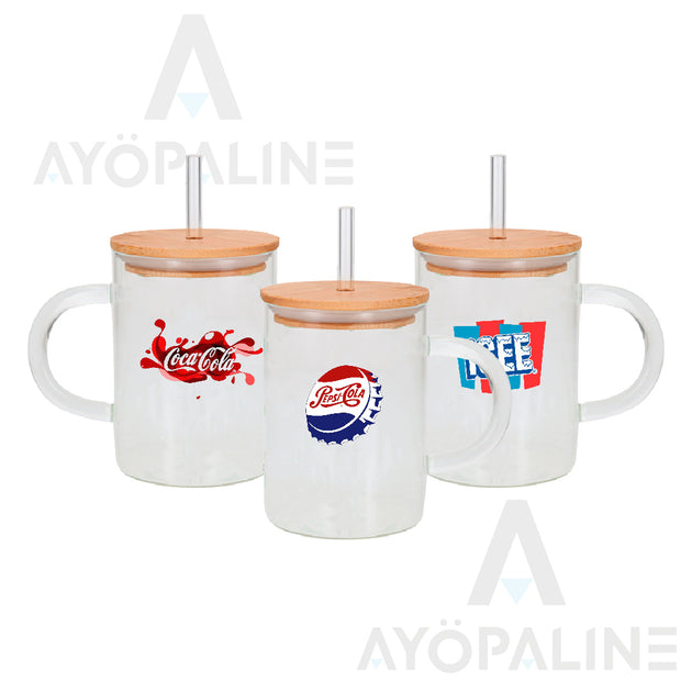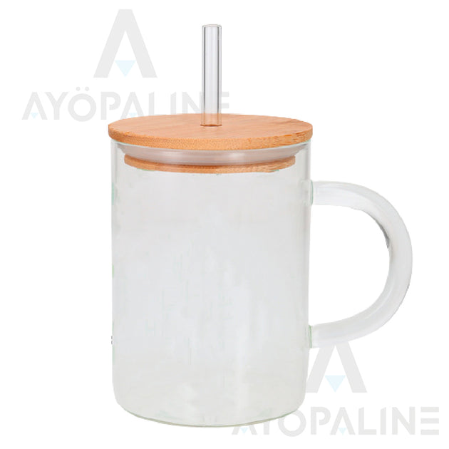 Tarro de vidrio con tapa de bambú y popote.