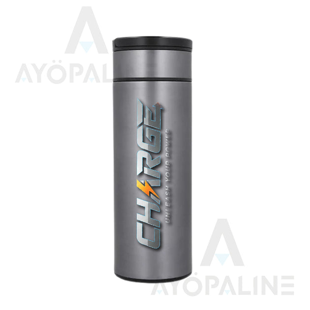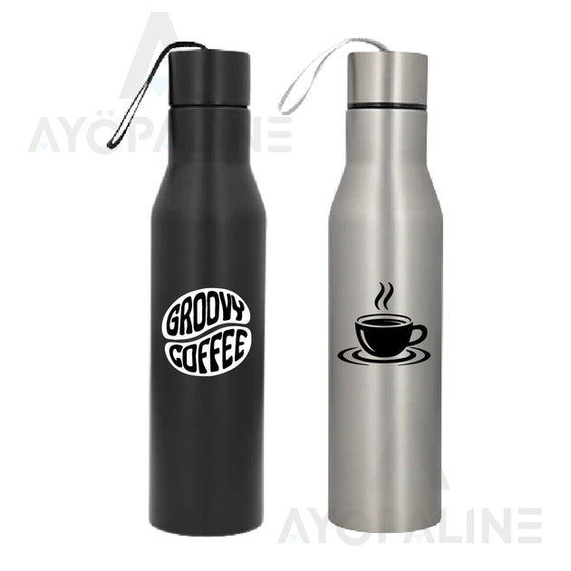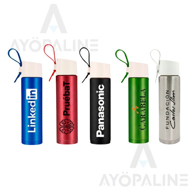 Termo de acero inoxidable con acabado mate y correa para sujetar. YAREN