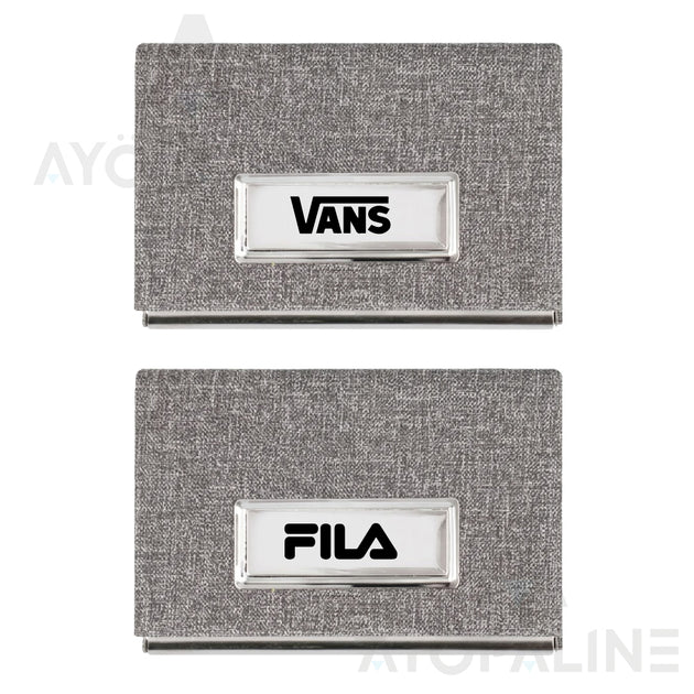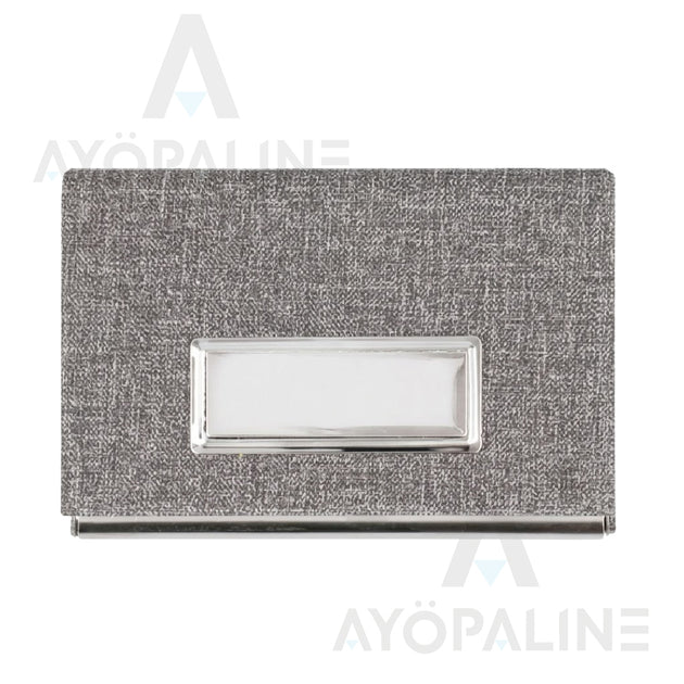 Tarjetero de aluminio con acabado textil y placa metálica.
