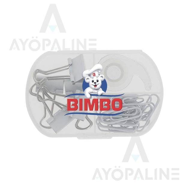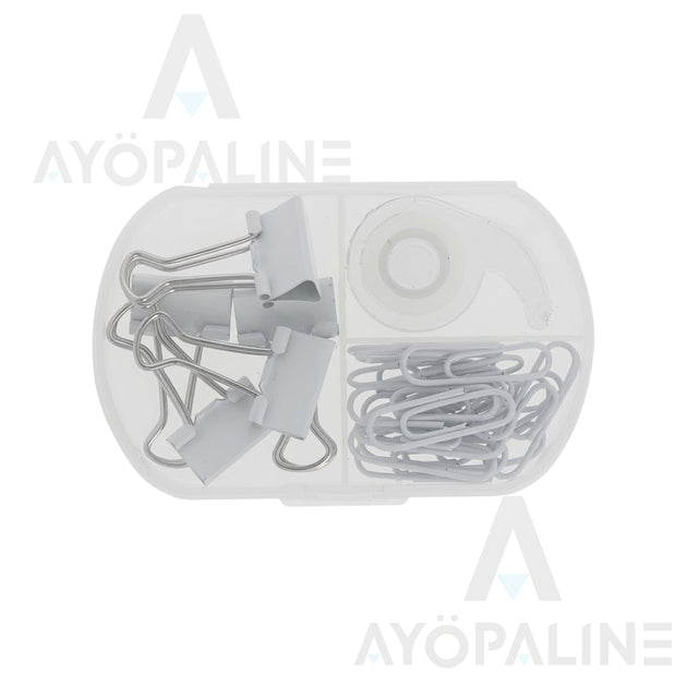 Set escolar de plástico con pinzas, clips, grapas, quita grapas, tijeras, engrapadora y cinta adhesiva.