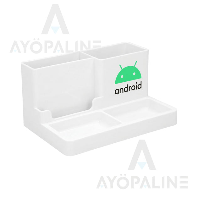 Organizador de plástico con compartimentos para lápices y accesorios.