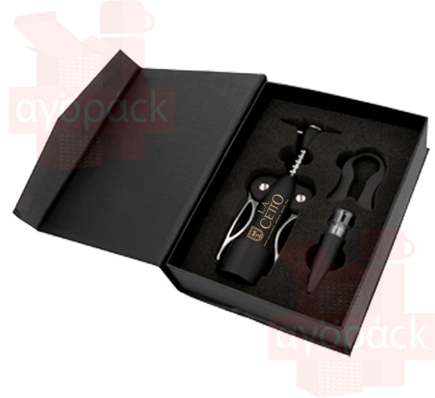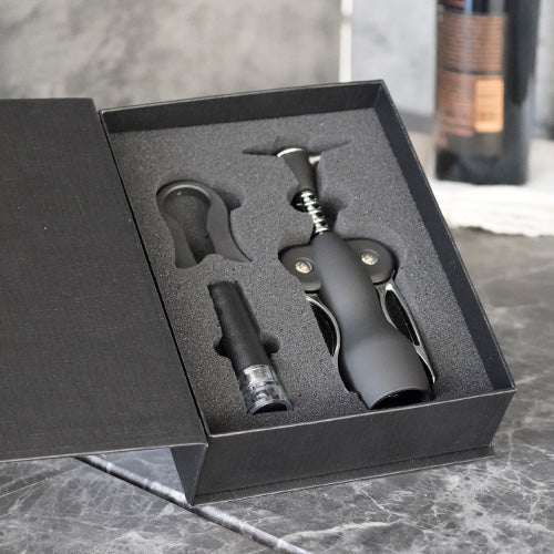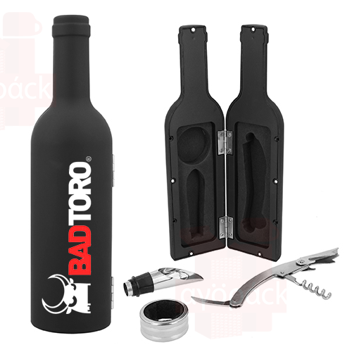 Set de vino con sacacorcho, boquilla, corcho metálico y corta gotas.