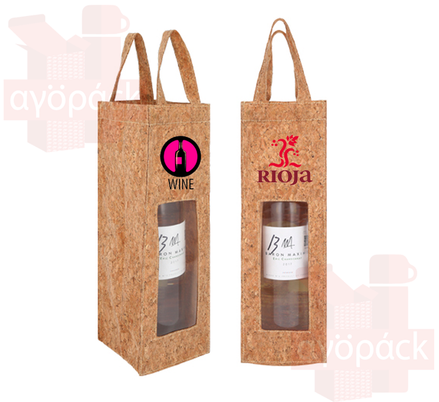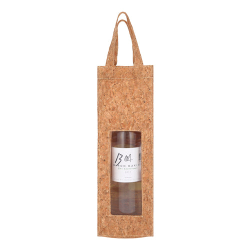 Estuche para vinos de corcho con asas y ventana de plástico.