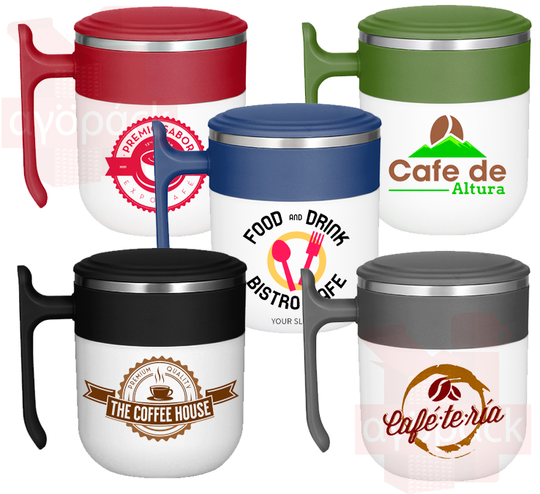 Termo de doble pared con interior de acero inoxidable y exterior de plástico.