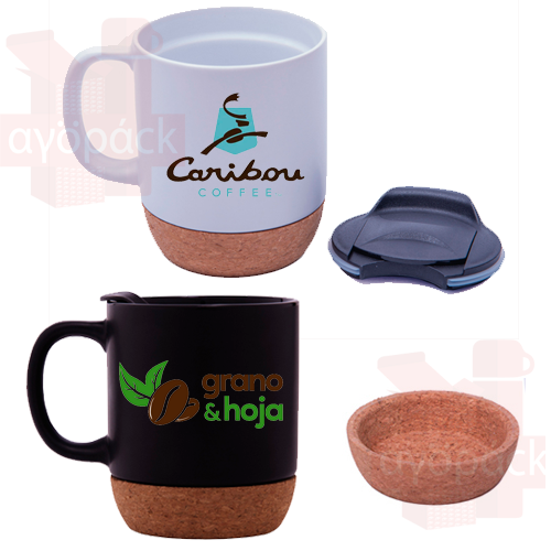 Taza de cerámica con acabado mate y base de corcho removible.
