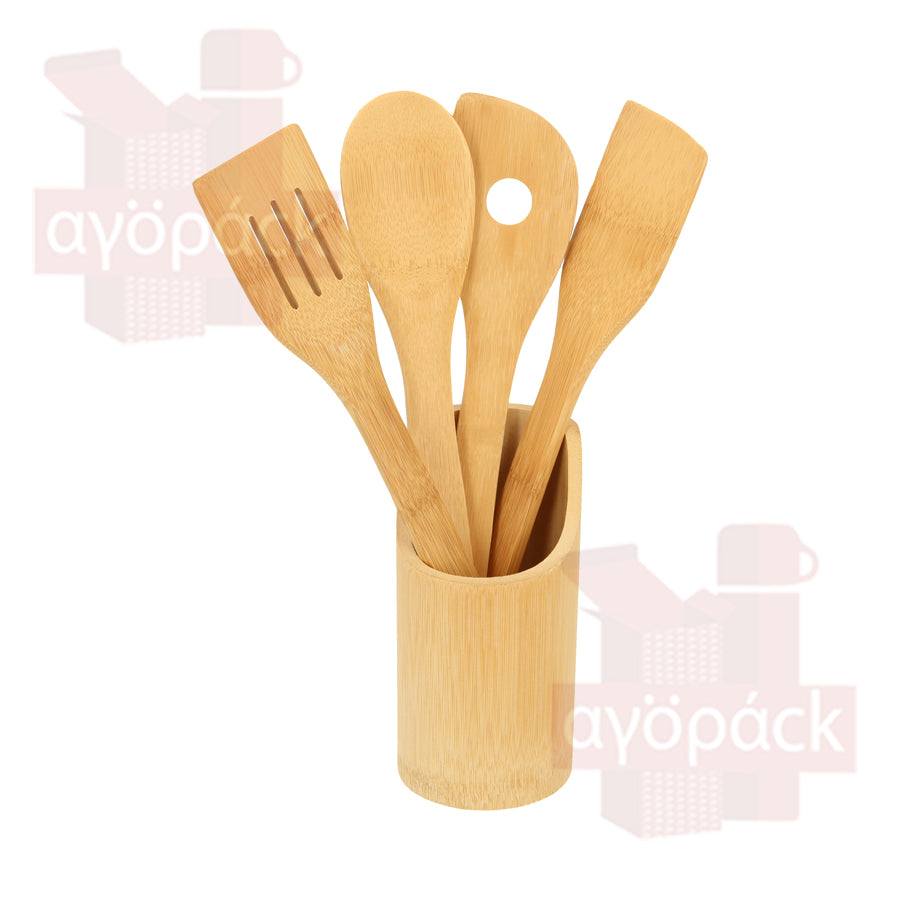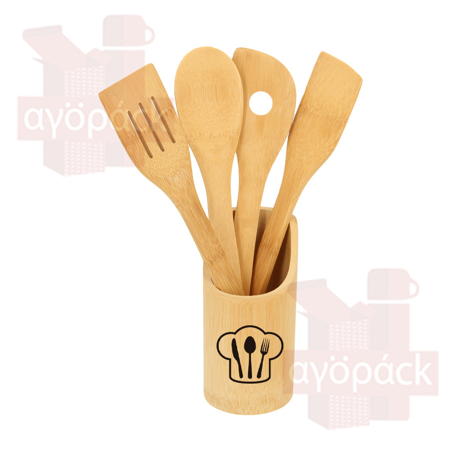 DEFINICION: Set de bambú para cocina que incluye base, cuchara, cuchara con medidor de porciones, pala y volteador.